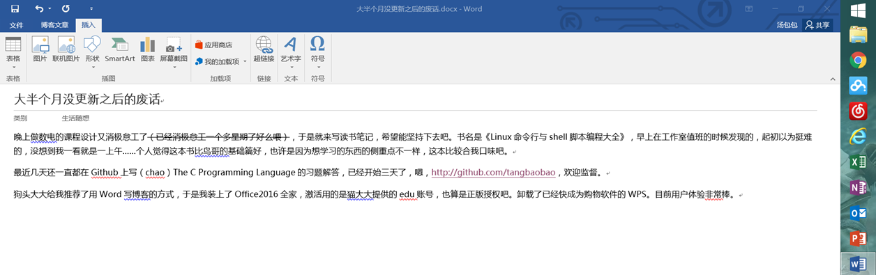 狗头大大(备案完就能访问了,好文章不少,高产如母猪,推荐)给我推荐了用Word写博客的方式,于是我装上了Office2016全家,激活用的是猫大大提供的edu账号,也算是正版授权吧。卸载了已经快成为购物软件的WPS。目前用户体验非常棒。如图: